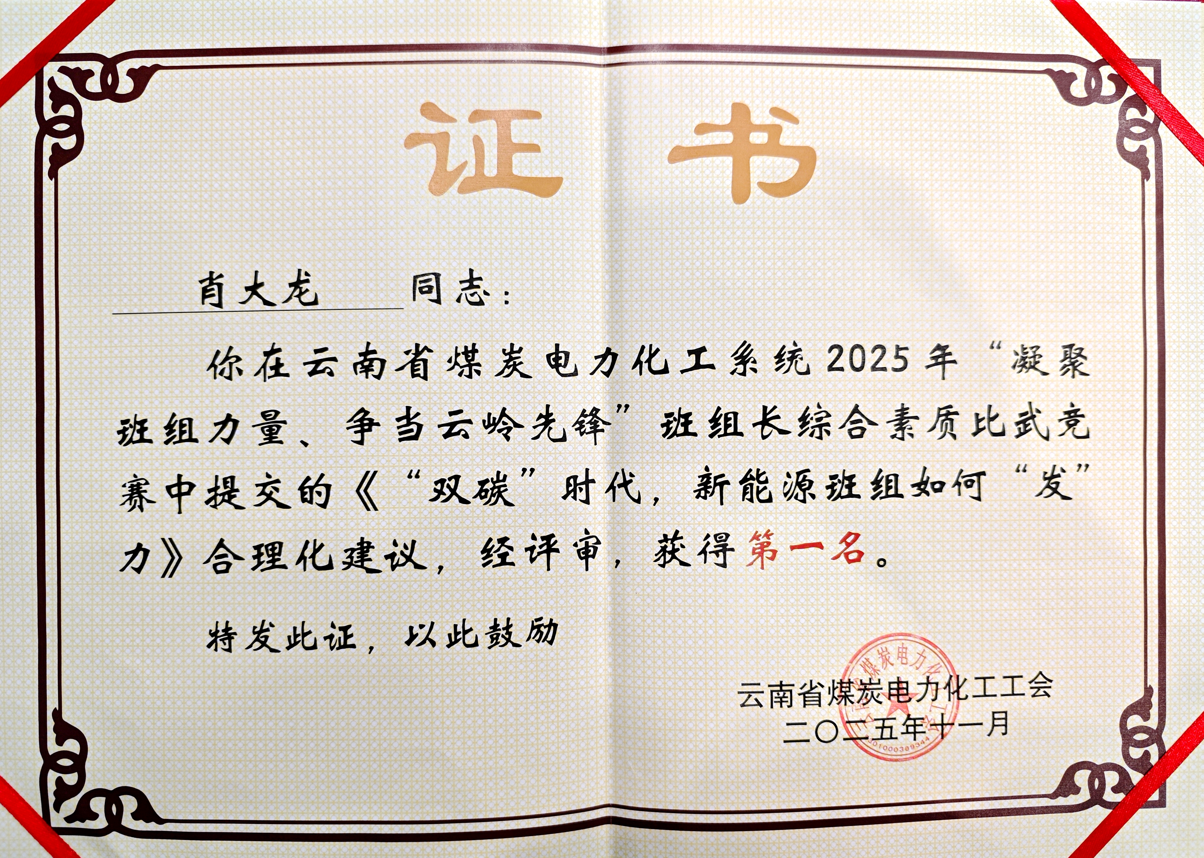 近日,由云南省煤炭电力化工工会主办、中国能源建设集团云南火电建设有限公司工会承办的2025年“凝聚班组力量争当云岭先锋” 班组长综合素质比武竞赛在昆明圆满落幕。大唐云南发电有限公司滇中新能源事业部选手肖大龙提交的《“双碳”时代,新能源班组如何“发”力》以第一名的成绩斩获“优秀合理化建议”,肖大龙以亮眼的表现获“优胜选手”称号。