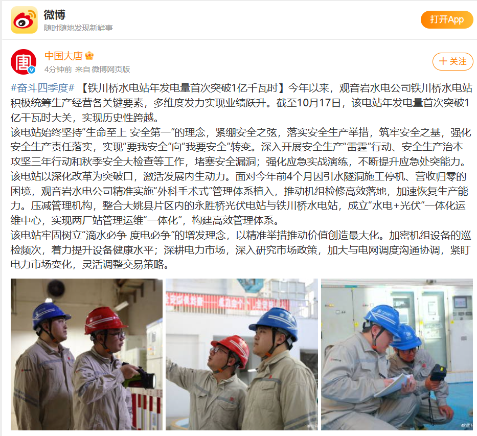 【微博、快手】观音水电公司铁川桥水电站年发电量首次突破1亿千瓦时