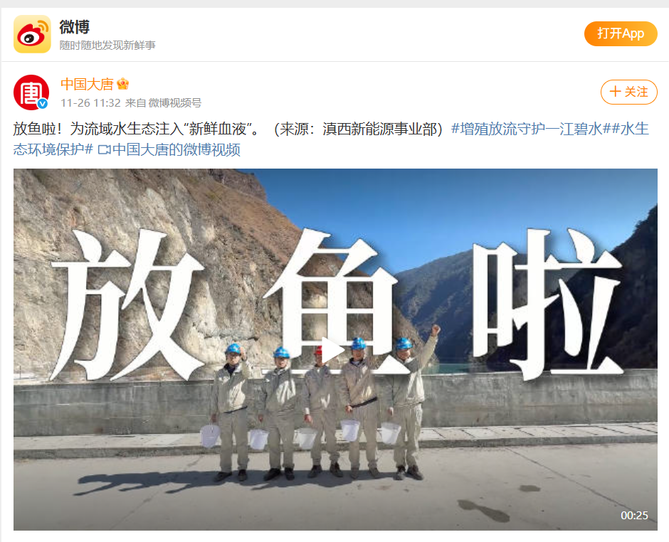 【微博】滇西新能源事业部:放鱼啦!为流域水生态注入“新鲜血液”