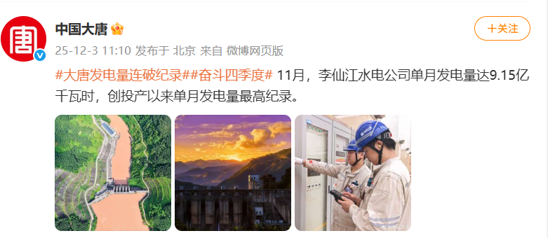 【微博】李仙江水电公司单月发电量创投产以来单月发电量最高纪录