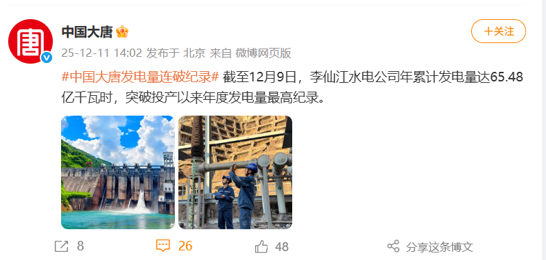 【微博】李仙江水电公司年累计发电量达65.48亿千瓦时,突破投产以来年度发电量最高纪录