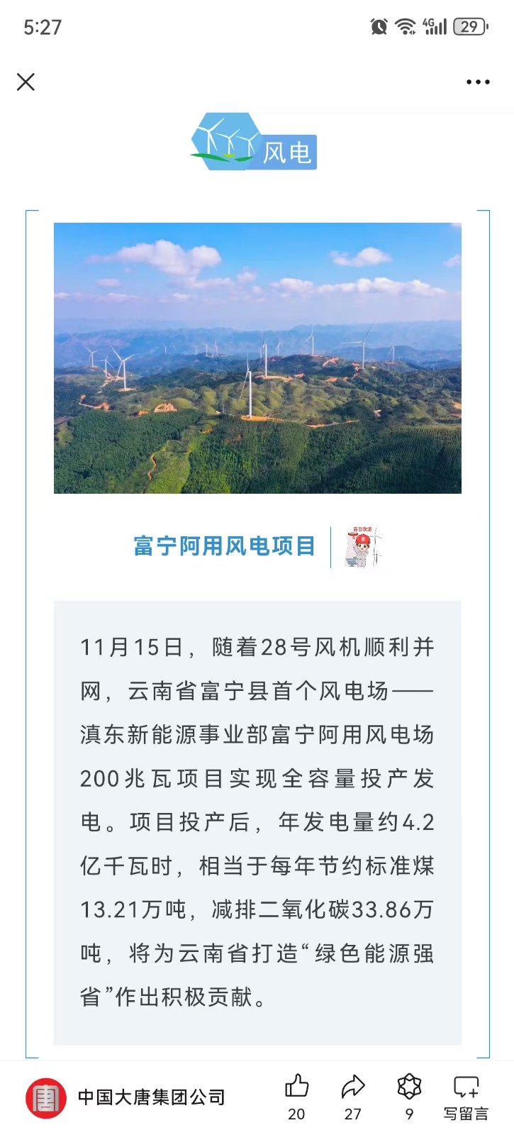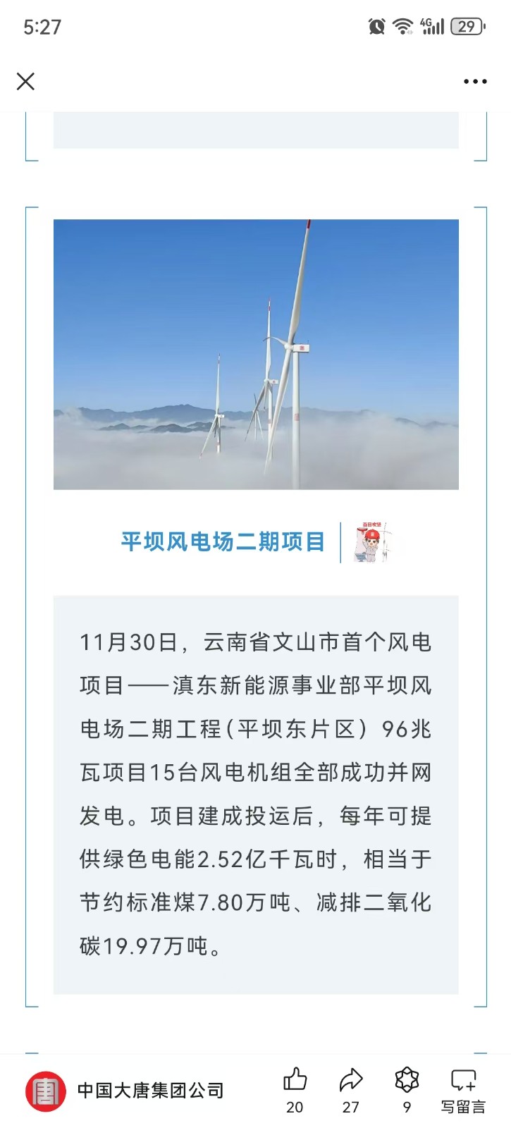 【中国网】大唐云南滇东新能源事业部平坝风电场二期工程全部机组成功并网发电