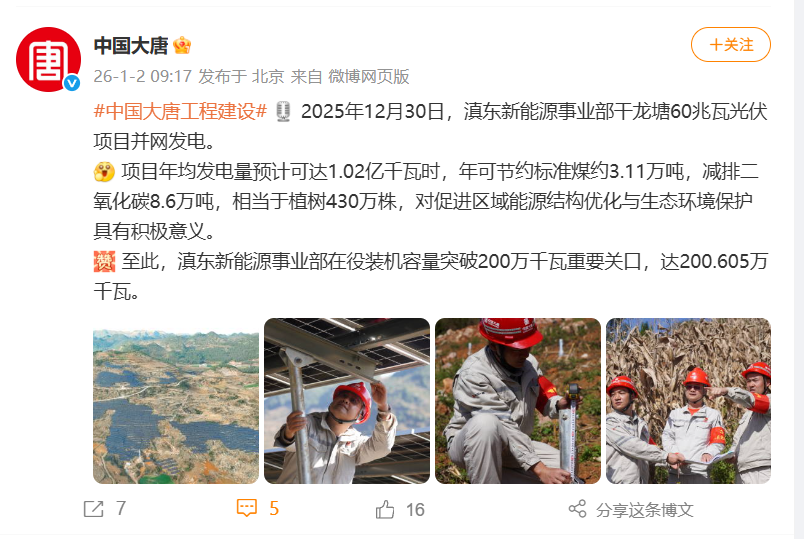 【微博】滇东新能源事业部干龙塘60兆瓦光伏项目并网发电