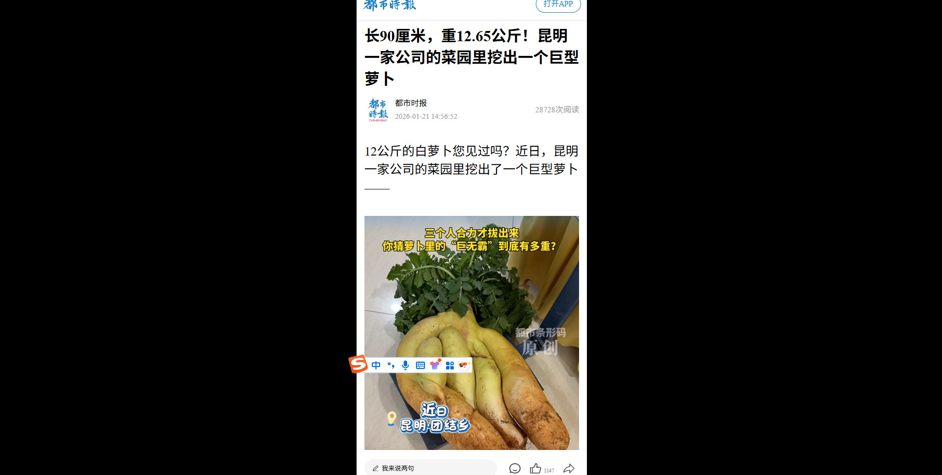 【都市时报、云视网】长90厘米,重12.65公斤!昆明一家公司的菜园里挖出一个巨型萝卜