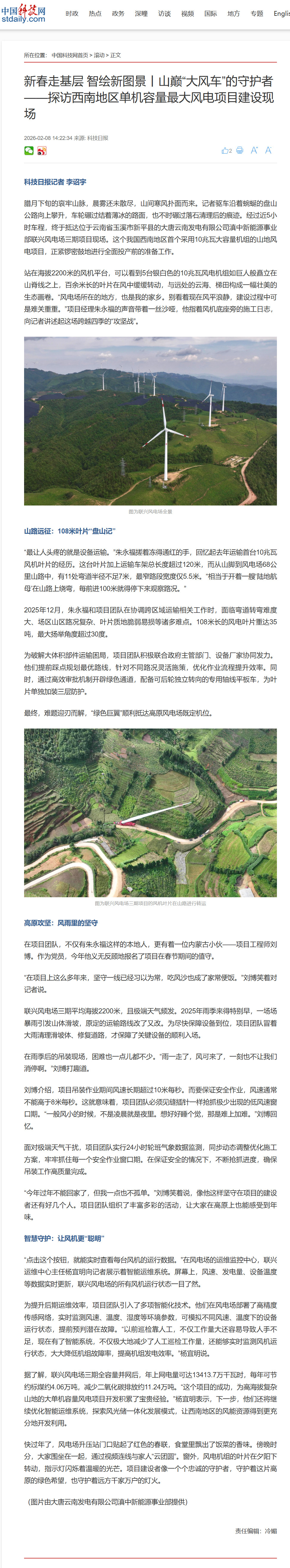 【科技日报】新春走基层 智绘新图景丨山巅“大风车”的守护者——探访西南地区单机容量最大风电项目建设现场