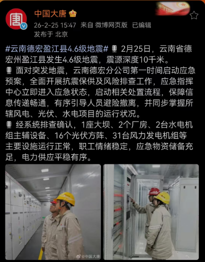 【集团公司微博】德宏分公司积极应对盈江县4.6级地震