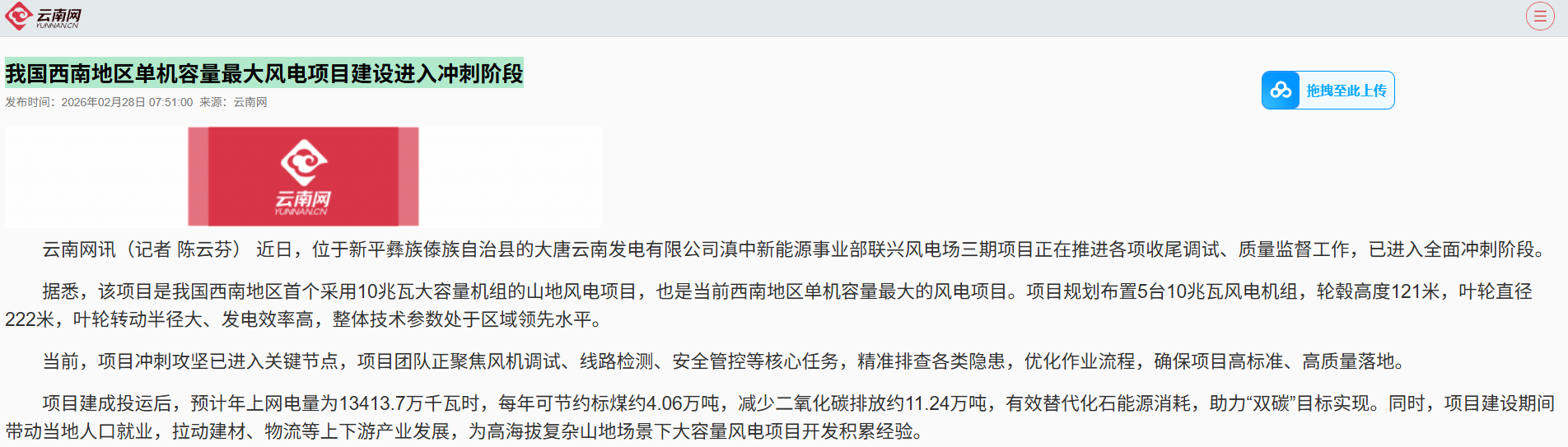 【云南日报】我国西南地区单机容量最大风电项目建设进入冲刺阶段