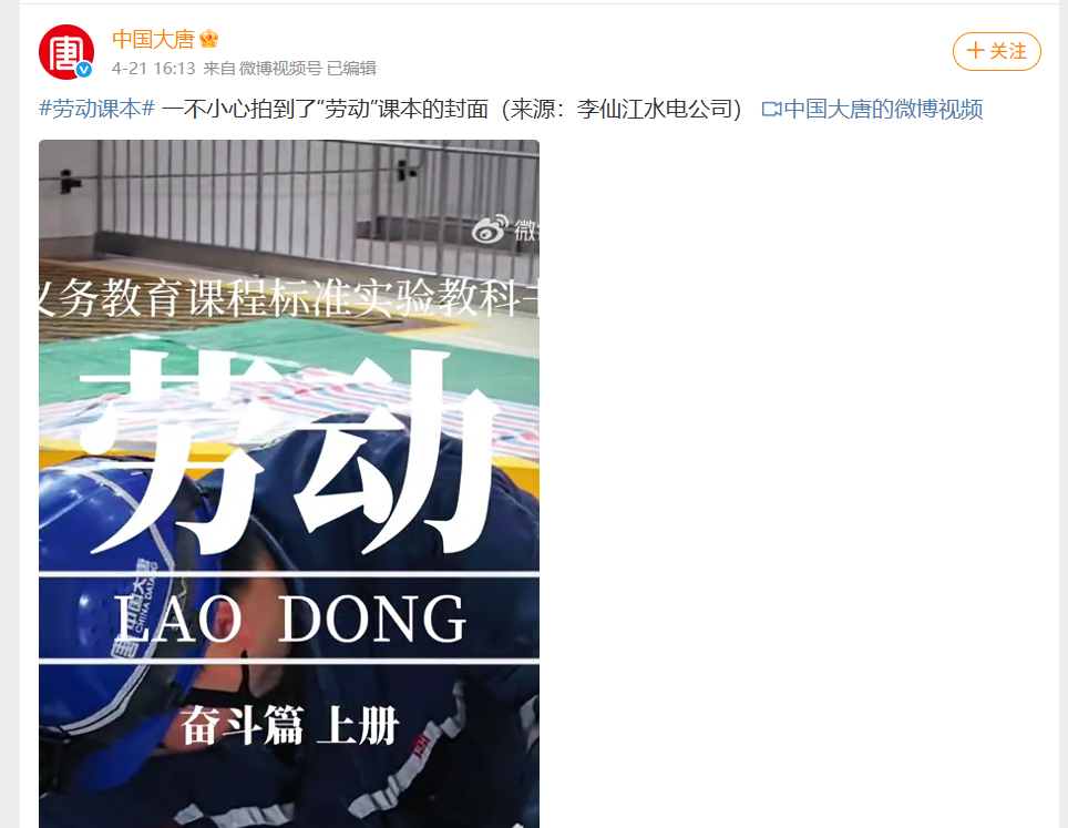 【微博】李仙江水电公司:一不小心拍到了"劳动”课本的封面