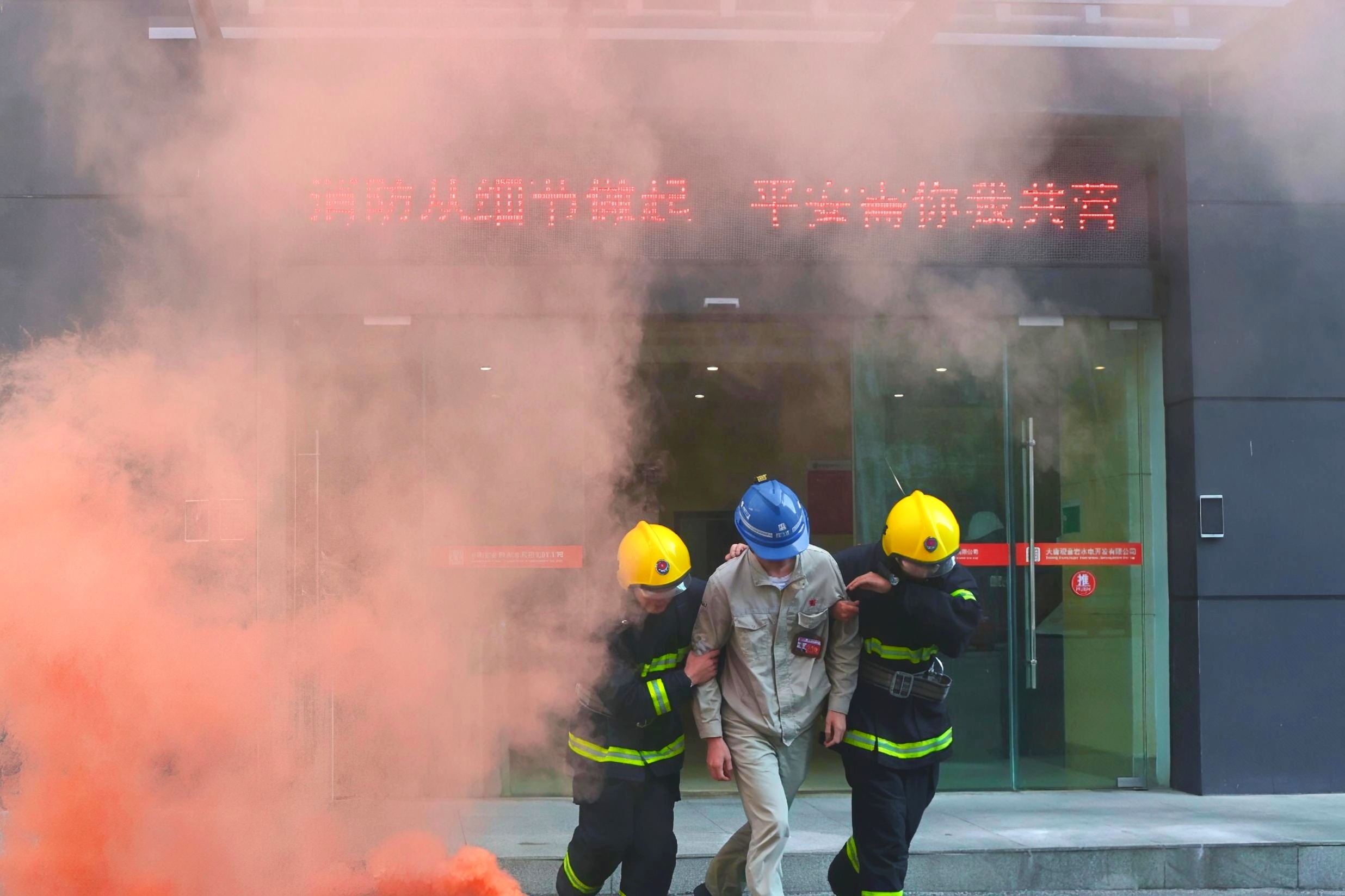 火灾扑灭后,各演练小组有序开展后续工作。演练期间,该公司还同步组织开展中控楼突发火灾应急疏散演练,参演职工按照预定疏散路线,弯腰低姿、捂住口鼻,快速有序撤离至安全区域,整个过程紧张有序、规范高效,进一步强化了全员应急疏散能力。