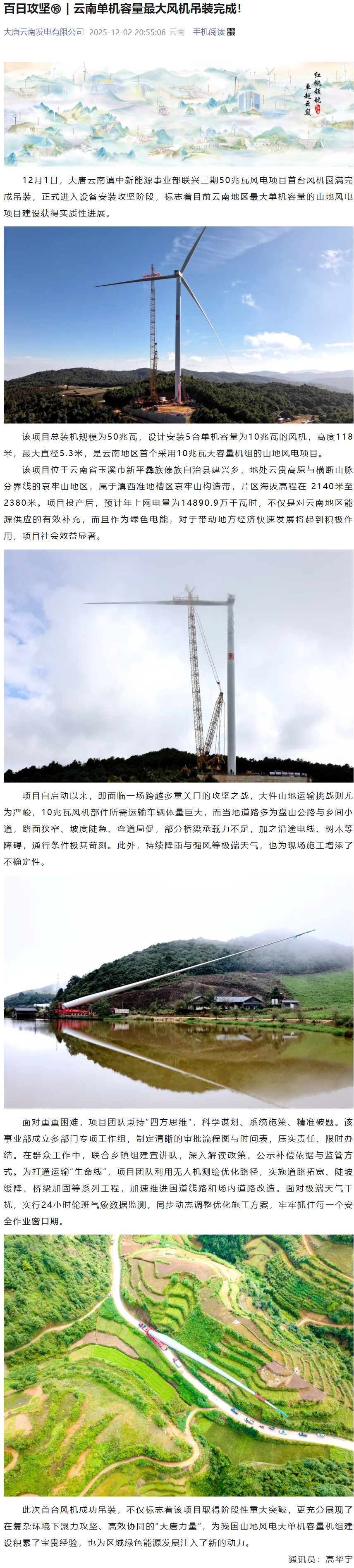 百日攻坚 | 云南单机容量最大风机吊装完成!