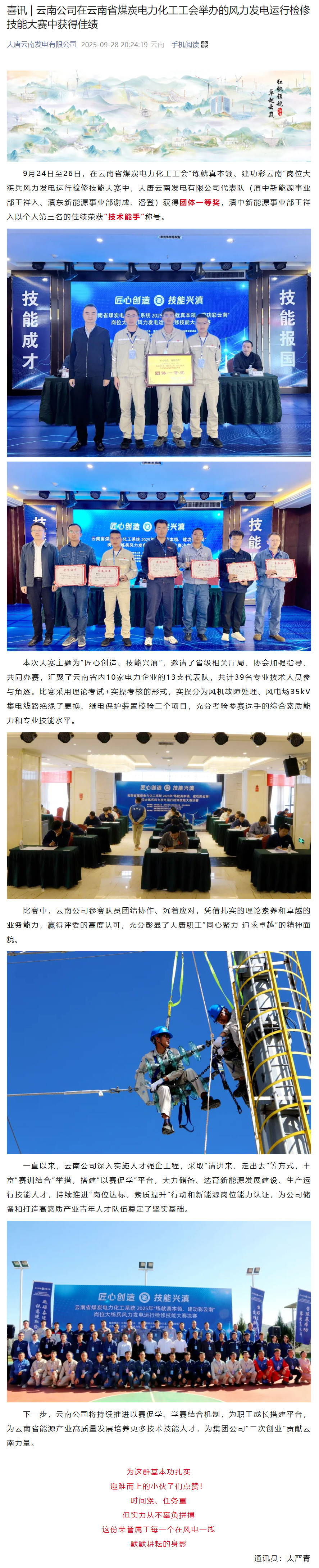 喜讯 | 云南公司在云南省煤炭电力化工工会举办的风力发电运行检修技能大赛中获得佳绩